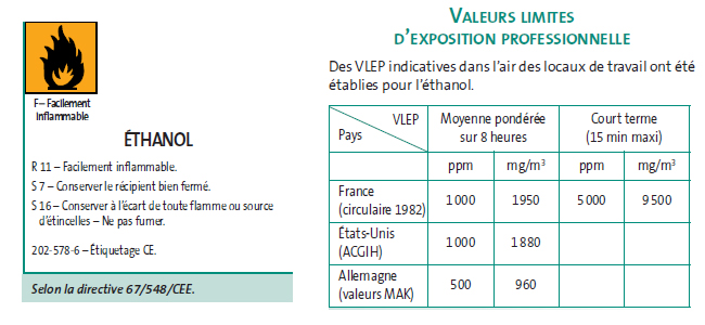 L'éthanol est un produit toxiqui qui doit être manipulé en vase clos, avec des équipements de protection. L'éthanol doit être stocké dans un local ventilé et il est interdit de fumer à proximité du produit.